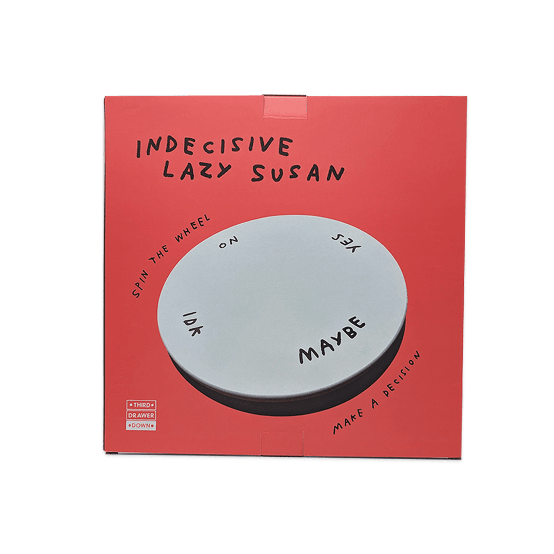 Introducing the "Indecisive Lazy Susan" by Adam JK—a whimsical and witty solution for those moments of indecisiveness. Spin the Indecisive Lazy Susan and let fate take the wheel as it determines your next move. Whether you're torn between options or seeking a touch of unpredictability, this charming addition to your table brings laughter and excitement to every choice. Crafted with care, it's not just a functional piece but also a conversation starter that adds a dose of amusement to gatherings. Embrace the uncertainty, embrace the hilarity, and let the Indecisive Lazy Susan guide you through life's little dilemmas, one spin at a time.